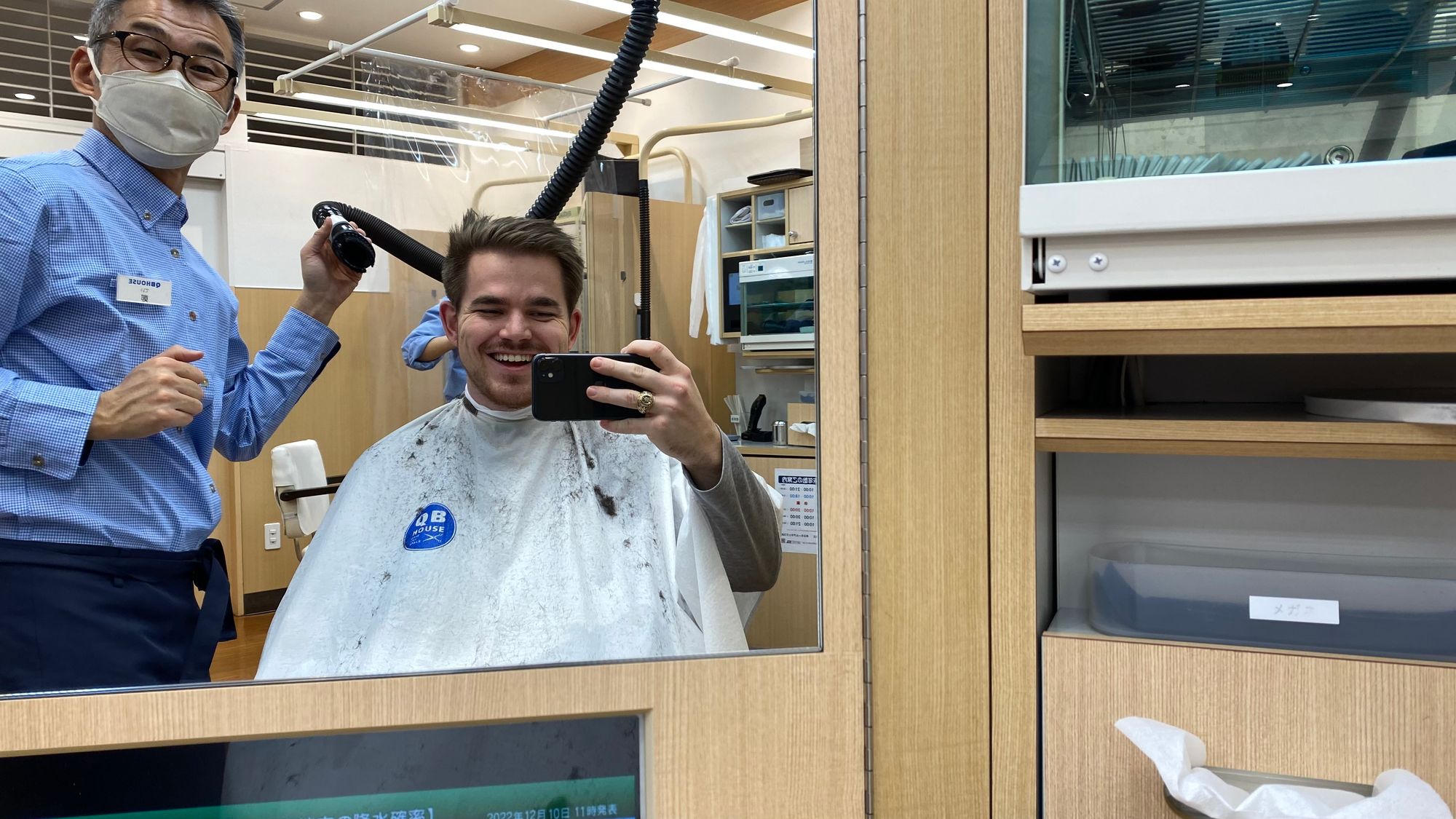 The place is called QB House and offers a $9 haircut (so cheap). You walk in and buy a ticket, they scan it, enter some info, and get to cutting. Towards the end, they have a vacuum to suck up all the loose hairs. I tried to be sneaky, but as you can see, I failed miserably haha.